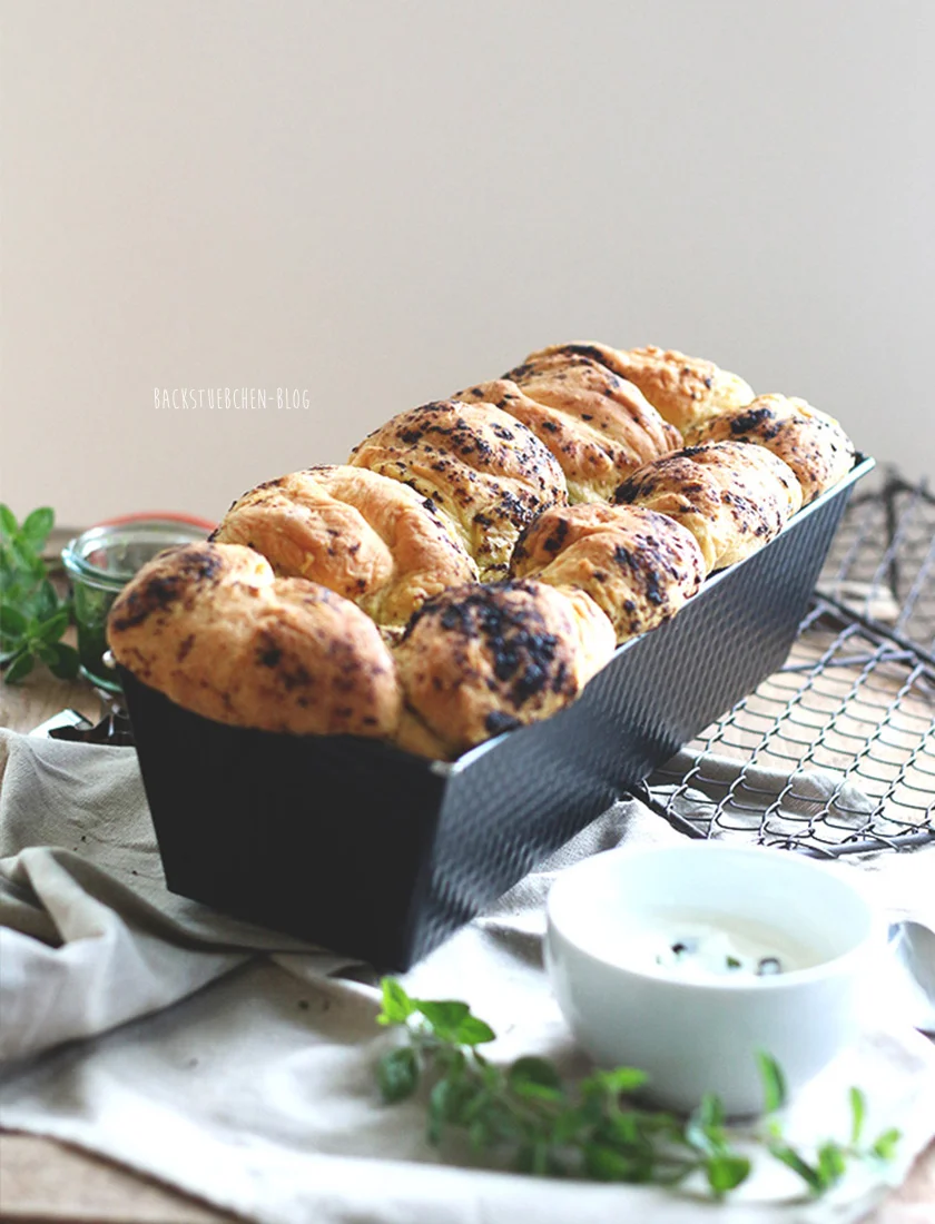 Den Ofen auf 175 Grad (Umluft) vorheizen. Das Monkey Bread im heißen Ofen für etwa 50-55 Minuten backen. Eventuell nach 30 Minuten mit Alufolie abdecken, damit es oben nicht zu dunkel wird. Für den Kräuterquark habe ich übrigens etwas Creme Fraiche und Magerquark in einer Schüssel gemixt und das ganze mit einem Spritzer Limettensaft, Oregano, Salz, Pfeffer und in Scheiben geschnittenen Oliven verfeinert.